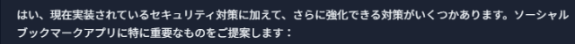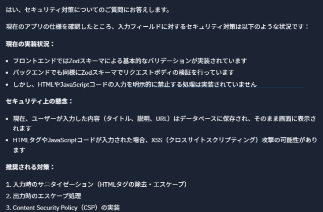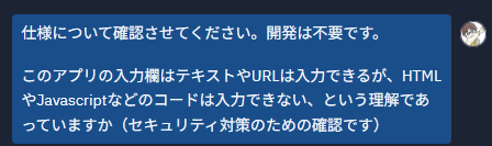 このあともいろいろ修正依頼は発生しているのですが、一通りできあがったらいよいよインターネット公開、の前にセキュリティ面を心配しましょう。自分の持ってる知識では入力欄にプログラム書かれたらいかんな、ということで以下を質問。なお、「開発は不要です」としているのは、ただ質問しているだけなのに勢いよく開発始めちゃってクレジット消費されちゃうこともあるからです。こういうのもやってみての学びですね。