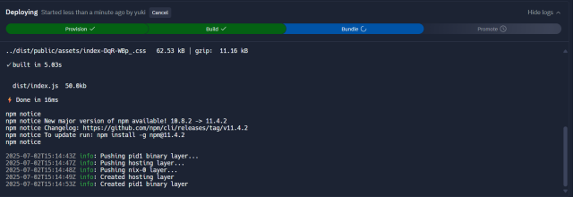 あとはひたすらデプロイ作業が終わるのを待ちます。