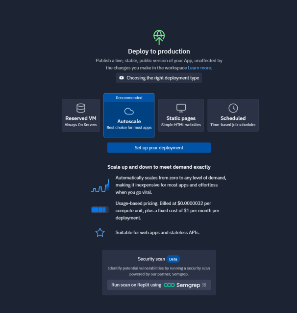 Deployに関してどの環境を選択するかなど説明がありますが、ひとまず進められるままにAutoscaleを選択。